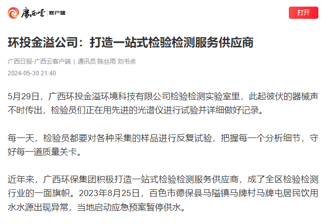 【逐梦五载 绿建未来】媒体关注:环投金溢公司 打造一站式检验检测服务供应商得到广西日报报道