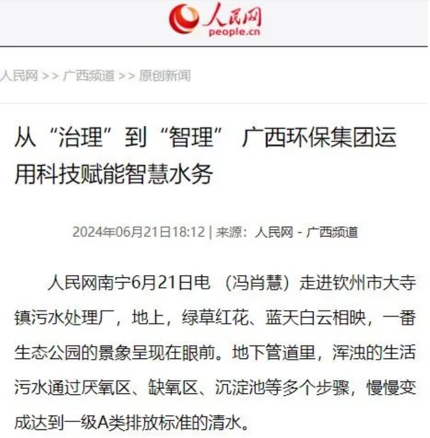 媒体关注丨人民网连续报道广西环保集团科技赋能智慧水务改善人居环境有力举措