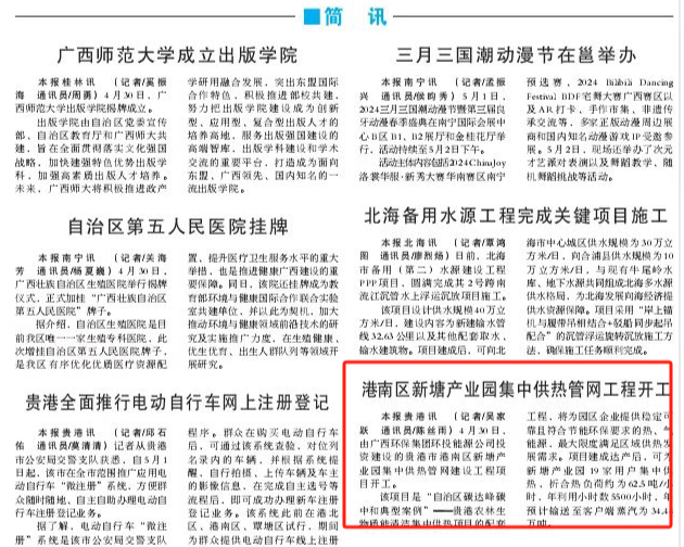 媒体关注|贵港市港南区新塘产业园集中供热管网建设工程项目开工得到广西日报报道