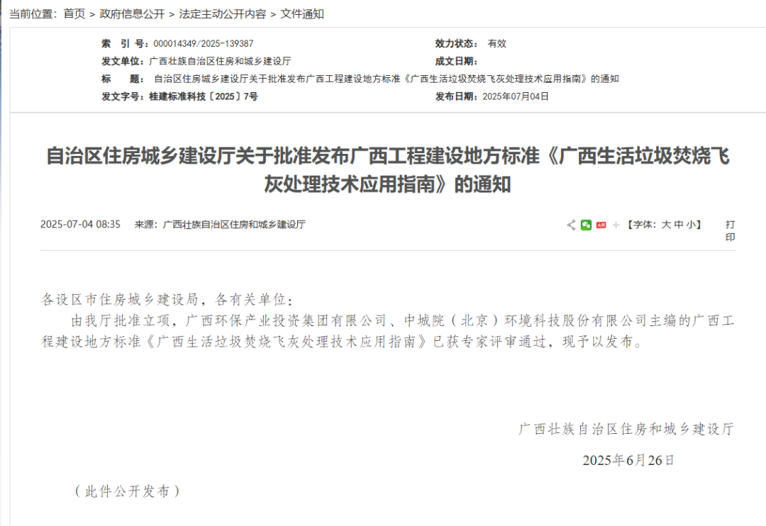广西环保集团牵头编制地方标准 助力固废处理行业发展——《广西生活垃圾焚烧飞灰处理技术应用指南》正式发...